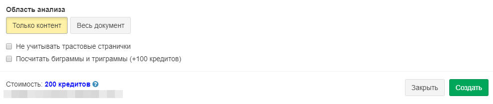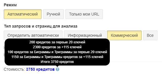 При отправке в ТА до 20 ключей взимается фиксированная стоимость — 200 кредитов. В эту стоимость уже входит расчет LSI и униграмм.