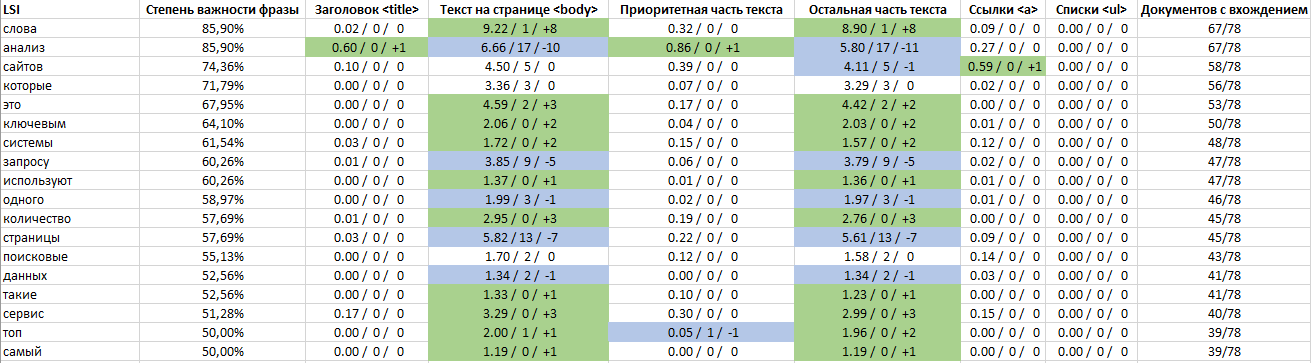 LSI-ключи — тематические семантические ключи. Упоминание слов, которые задают тематику и математический вектор текста позволяет сформировать и улучшить SEO релевантность документа к целевым ключевым запросам. Так, например, для запроса «текстовый анализатор» — LSI запросами будут слова «поисковые», «ключевые», «запросы», «страницы».