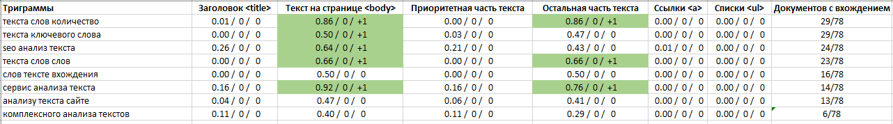 Посчитать биграммы и триграммы (+100 кредитов) — расчет n-грамм состоящих из двух или трех слов, что чаще всего встречаются в текстах конкурентов, позволят вам выявить те формулировки что косвенным образом влияют на тематичность текстов и их важных аспектов.