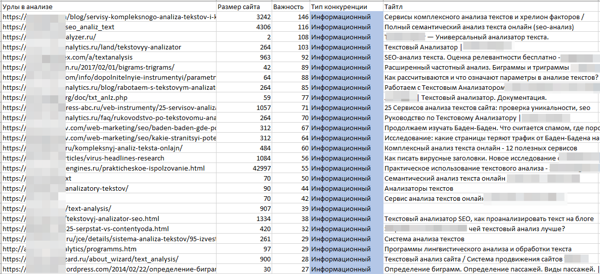 Список URL участвующих в анализе с весом значимости