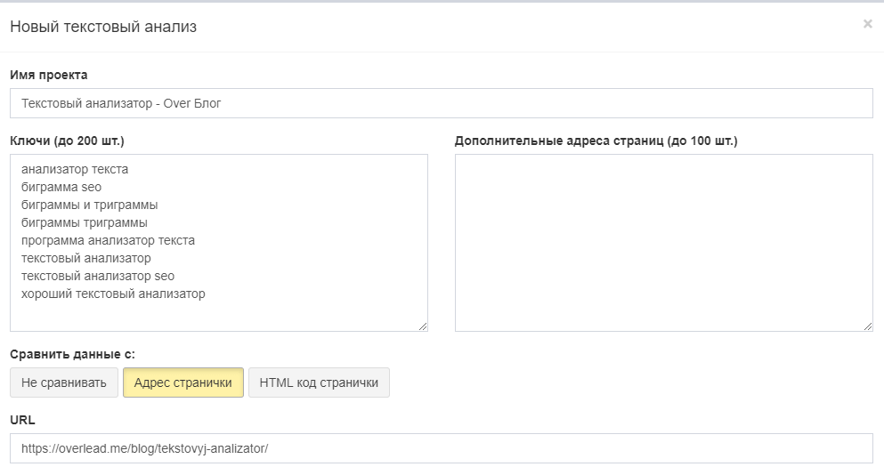 Ключи (до 200 шт.) — список поисковых запросов, по которым будет вестись анализ, крайне важно чтобы ключи были из одного кластера (предназначались для одной страницы).