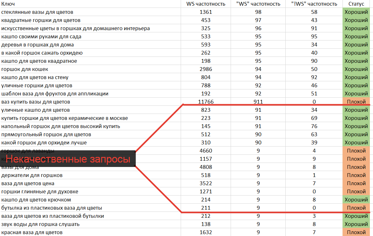 В случае если вам не нужны низкочастотные запросы — оставьте галочку и запросы с частотностью менее 10 будет помечены как плохие.