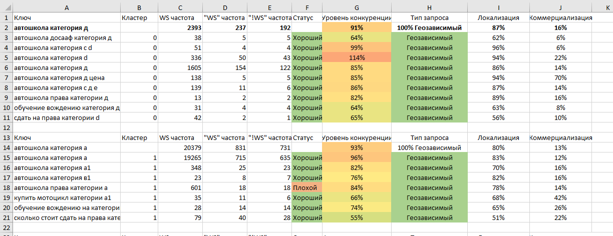 В отчете вы получаете запросы разбиты по кластерам с данными: