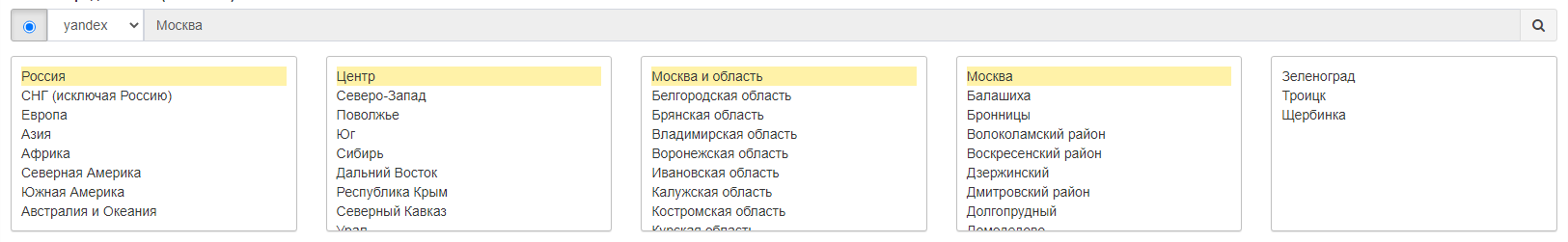 На выбор доступны все города и регионы России и СНГ в поисковой системе Яндекс