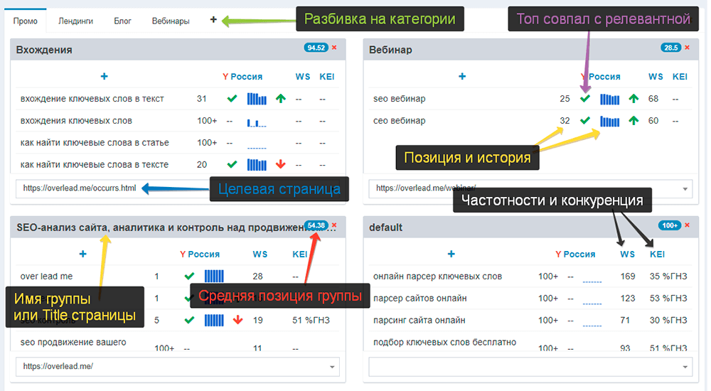 Помимо позиций предоставляется аналитика с разбивкой на страницы и категории страниц.
