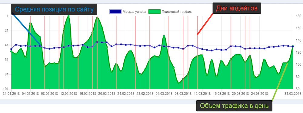 На графиках строится средняя позиция запросов для сайта и трафик, что позволяет видеть закономерность.